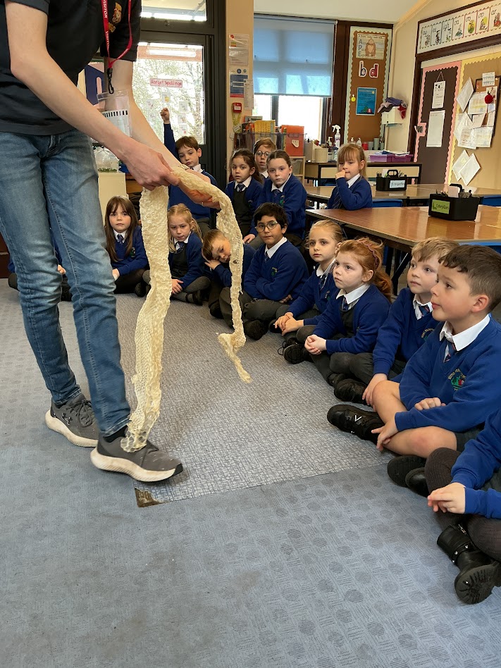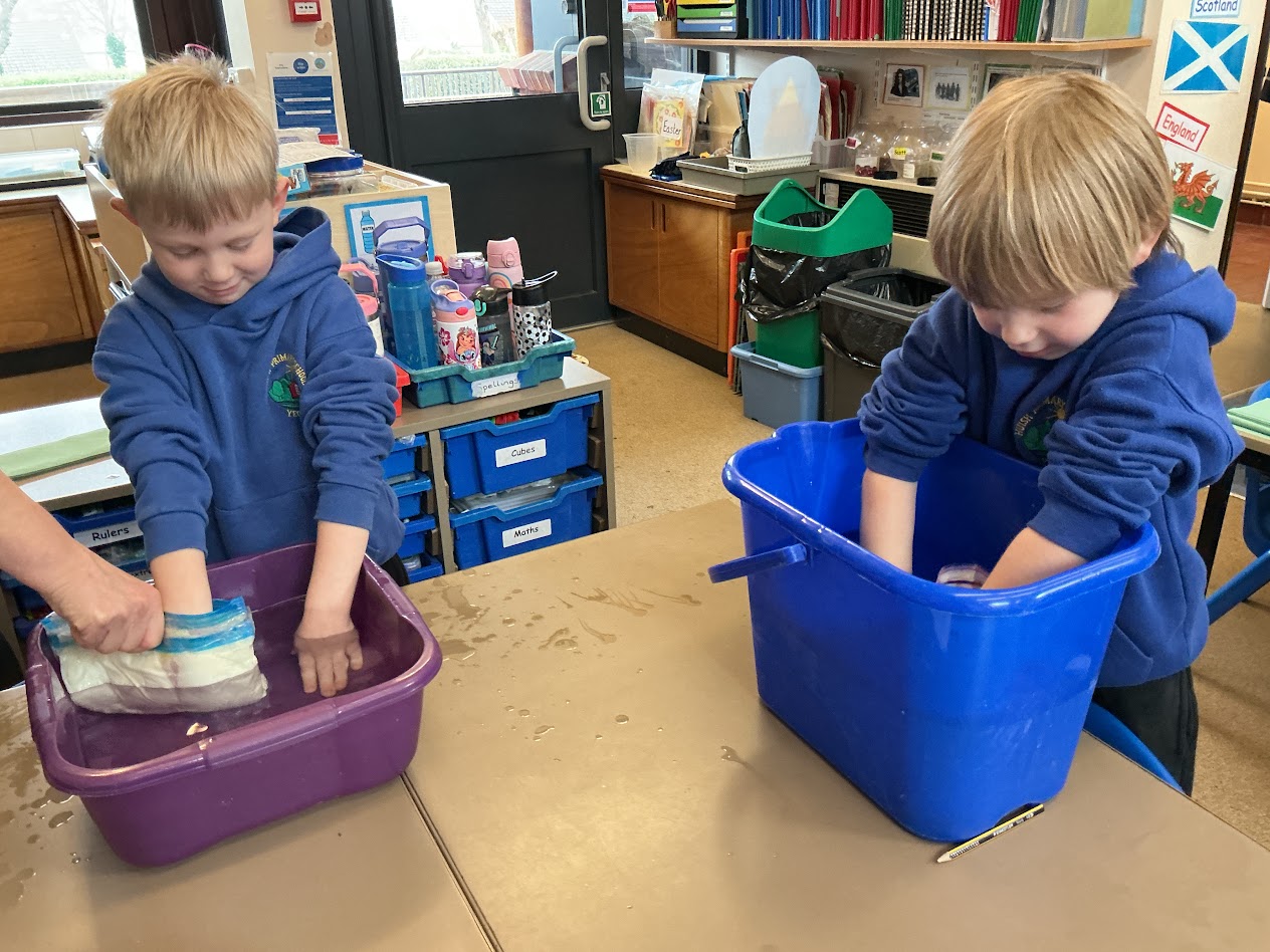 Later on in the week, we had a discussion about baby animals and what we call them. We were lucky to have a visitor from Longleat who taught us all about the 5 animal groups. We conducted an investigation to see whether blubber works to keep penguins and other polar animals warm. We used a vegan fat blubber glove and tested it in the some icy, cold water. It kept one hand warm but the unprotected hand got cold very quickly! After the experiment, we discussed our results.