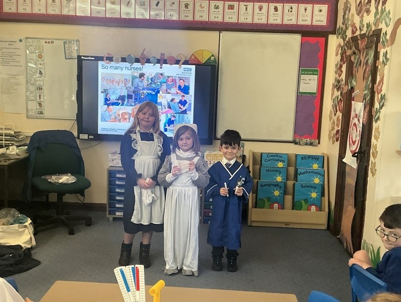 This afternoon we were lucky enough to have a visit from Mark who works at the NHS. He came to speak to us about the vital work that the NHS do to help people. We discussed some of the important jobs that people in the NHS do before thinking about what it is like to work in a hospital. We shared with him our knowledge of Florence Nightingale and he told us about how hospitals have changed since the Victorian era. These changes included cleanliness, uniforms and knowledge of medicines. Some of us even got to try on the uniforms!