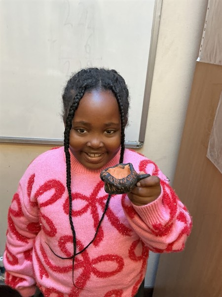 We spent a lesson experimenting with clay. This involved using different methods to shape it into a pot, as well as to create patterns and designs in the clay.