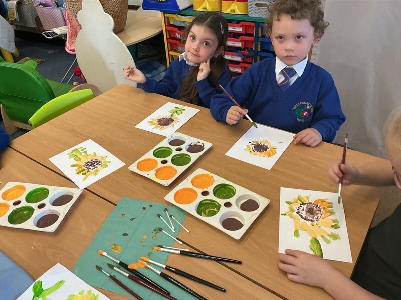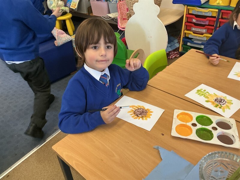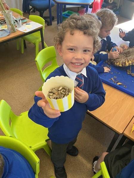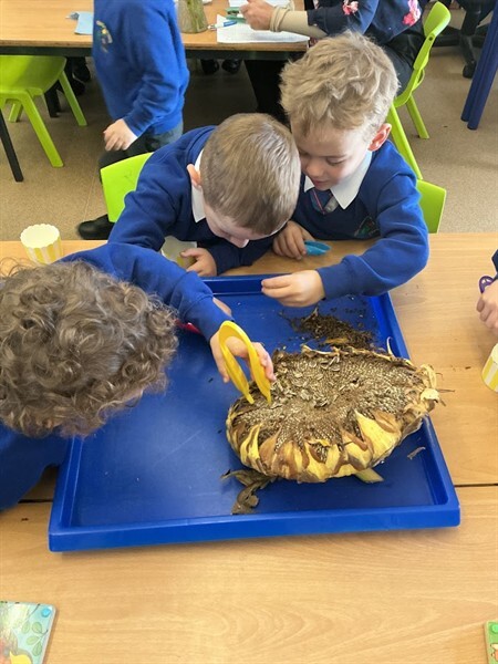 This week we have been learning about harvest. We have learned some harvest songs such as ‘Big Red Combine Harvester’ and have looked at how farmers gather crops in the Autumn to make sure we have plenty of food in the winter months. We have looked at some of the plants that we can grow and harvest for food in this country, including corn, wheat and sunflowers. We were lucky enough to have a huge sunflower head to explore and harvest the seeds from using tweezers and our fingers! We will keep the seeds safe over winter and plant them in Spring. We have also enjoyed painting beautiful sunflowers which can be seen displayed in our classroom.