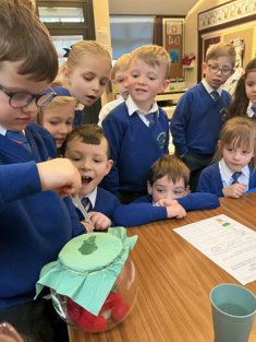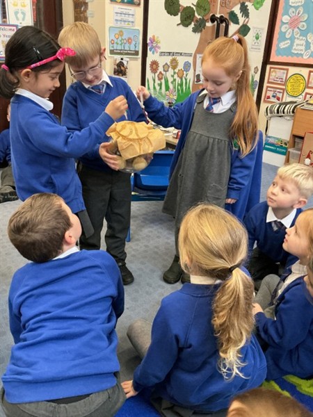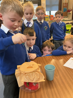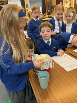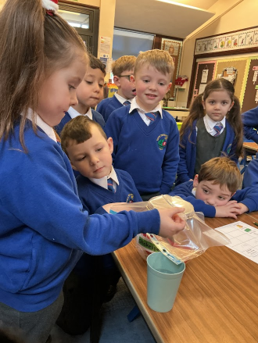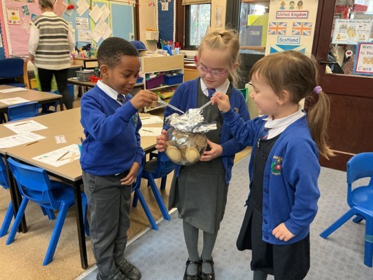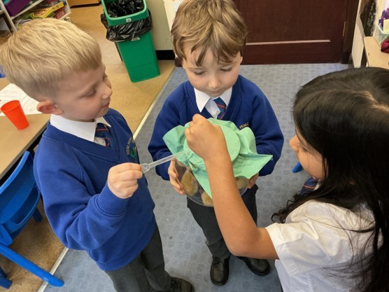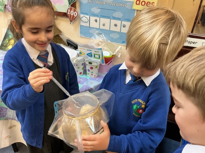 Today we explored two new scientific words - ‘waterproof’ and ‘absorbent'. We conducted a fair test to discover the properties of four different types of material, and discussed which material we felt would make the best umbrella. We found that metal and plastic were waterproof, and following discussion, decided that plastic would make the best umbrella because it can be dyed or see-through (transparent). We thoroughly enjoyed experimenting!